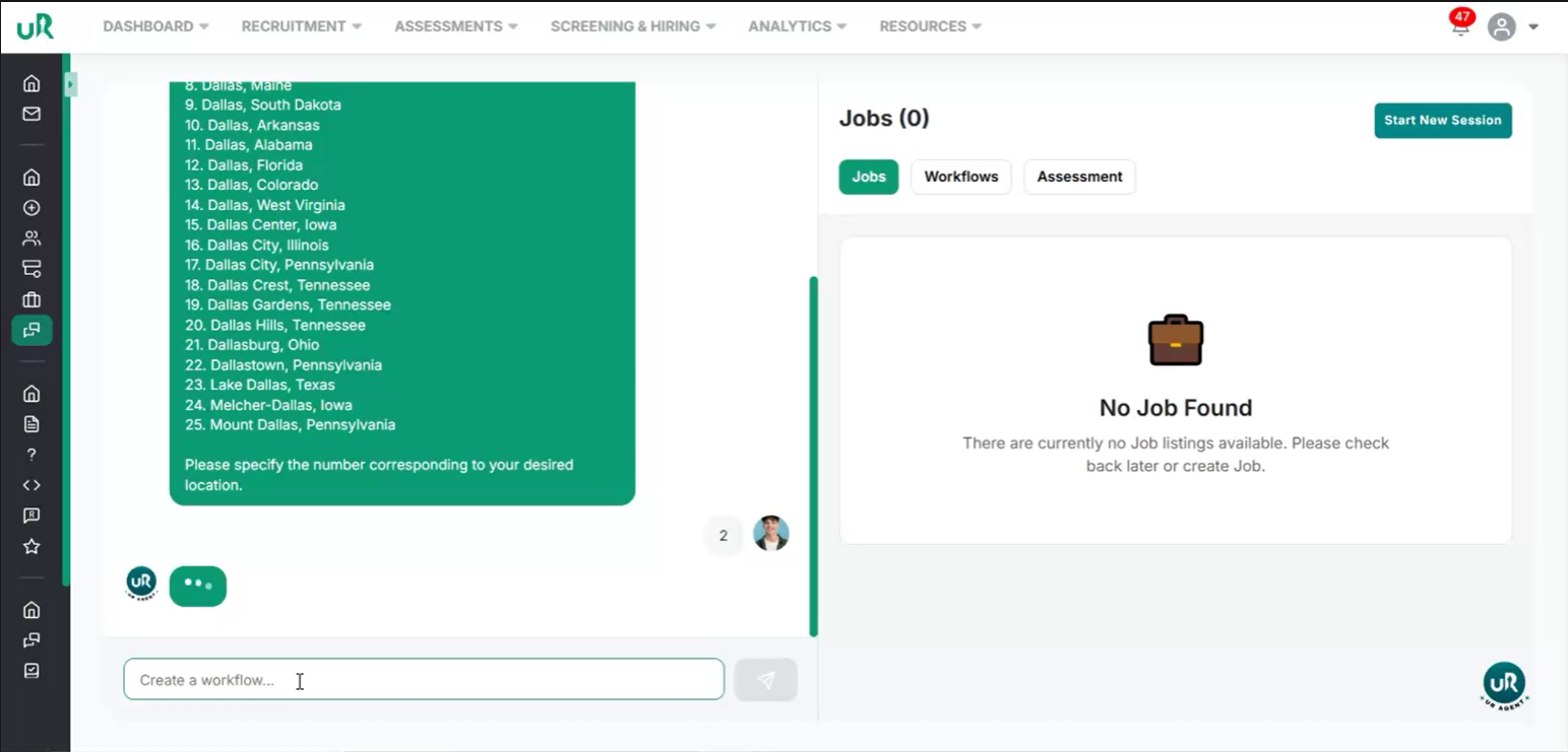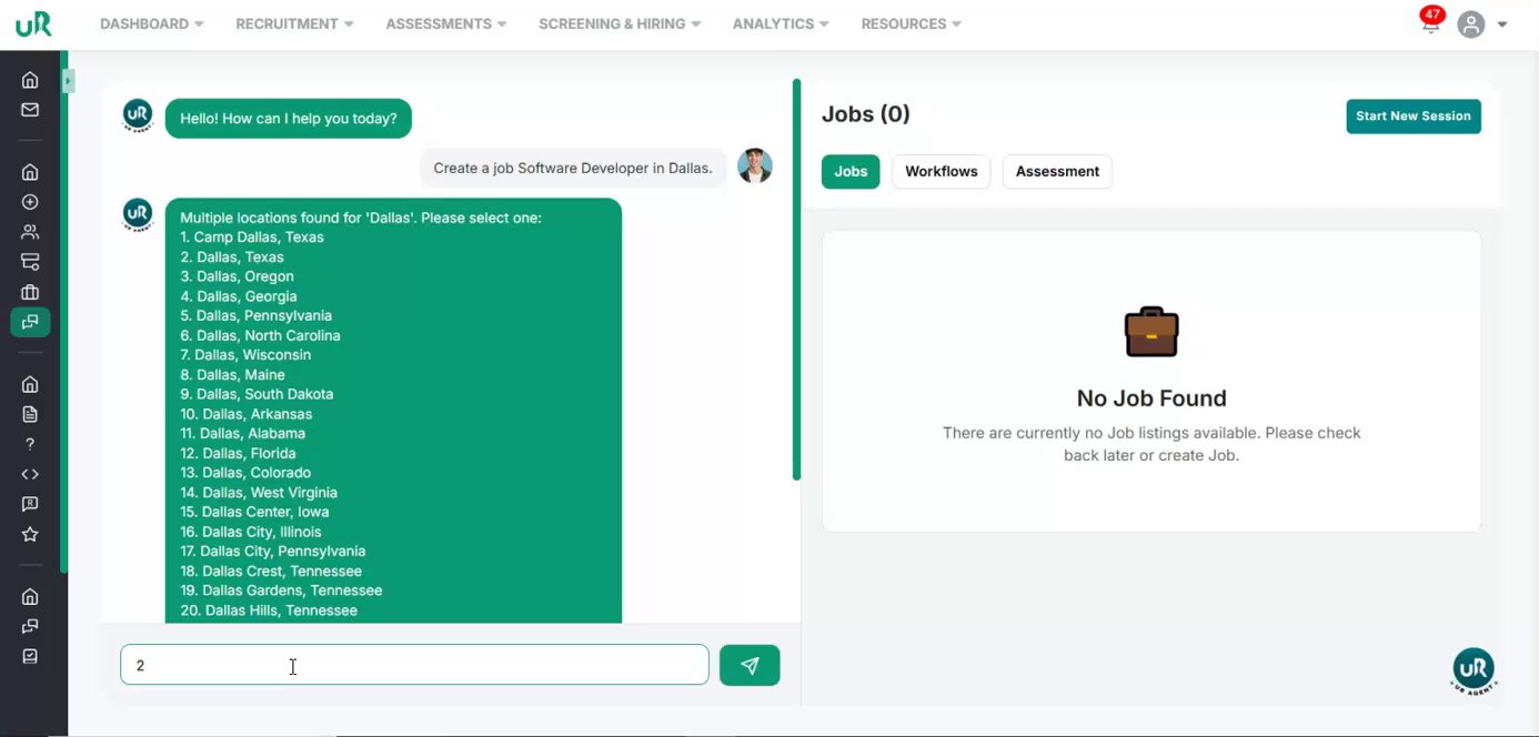 Start Creating a New Job and Select Location Let’s start by creating a job for a software developer in Dallas. We will begin by creating a new job in the system with a simple command “Create a job Software Developer in Dallas”. It will first set the job location to “Dallas.” The agent will automatically search for matching locations based on your input.