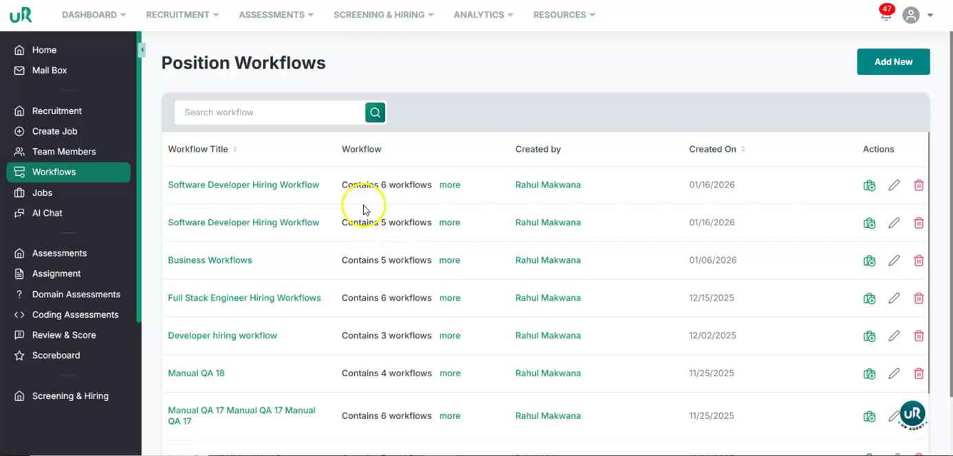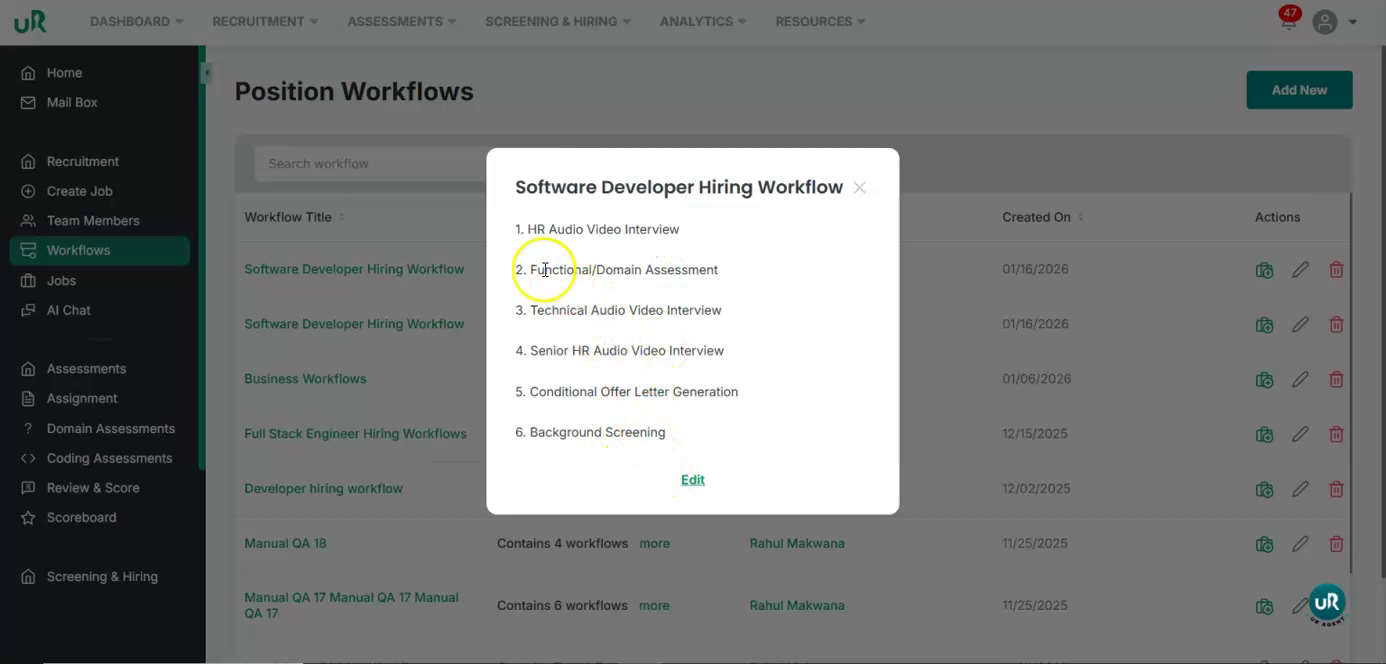 It will create the workflow. Begin by reviewing the various assessment stages associated with the job position, such as the HR round, technical round, and senior HR round.