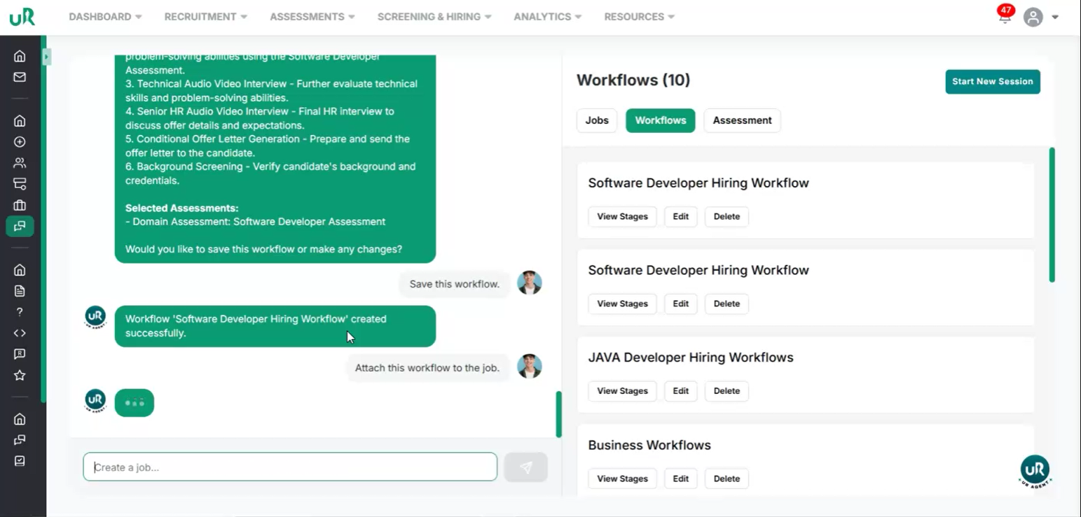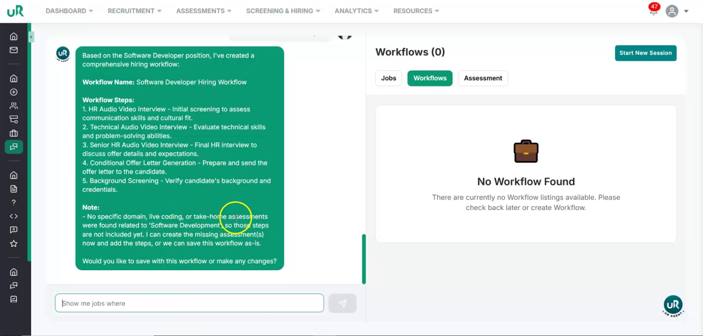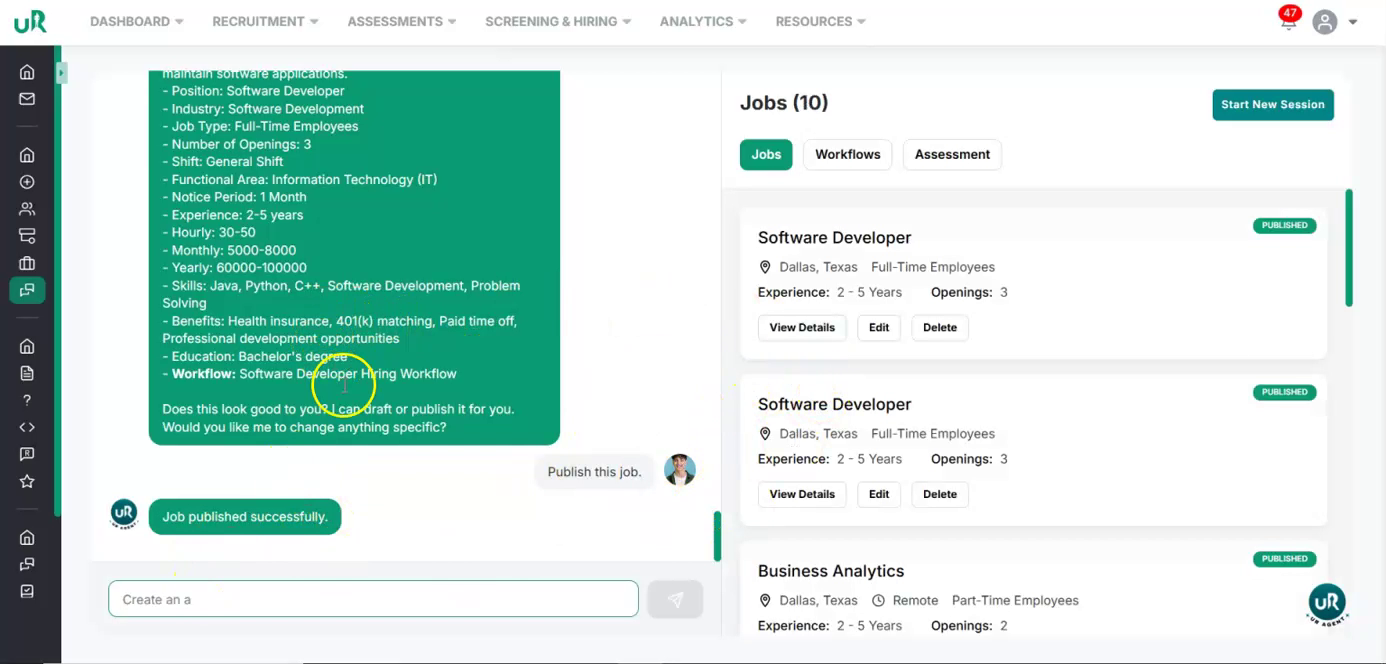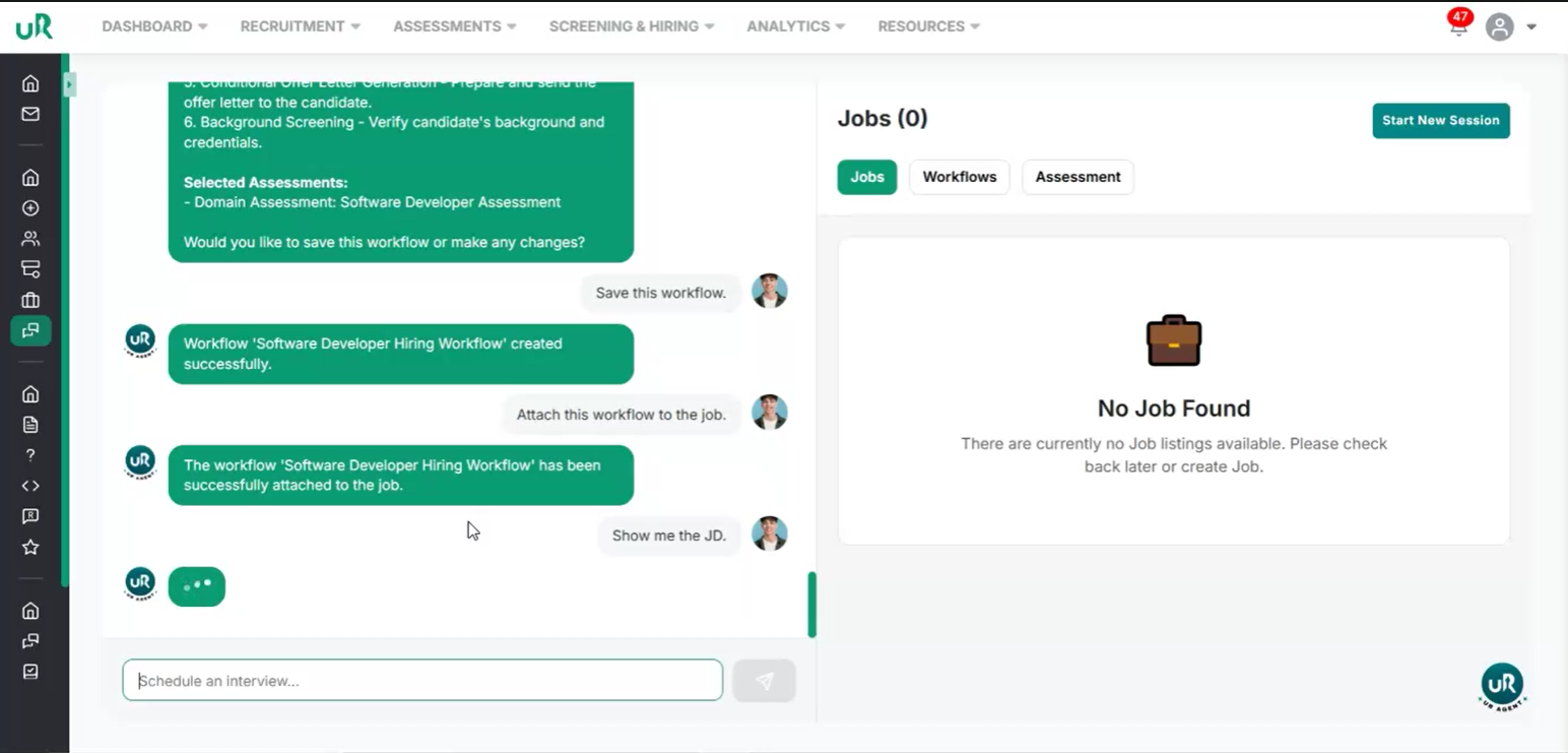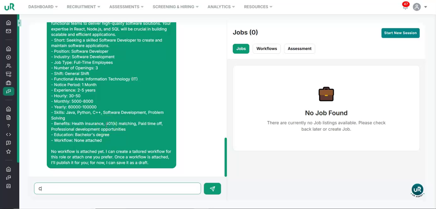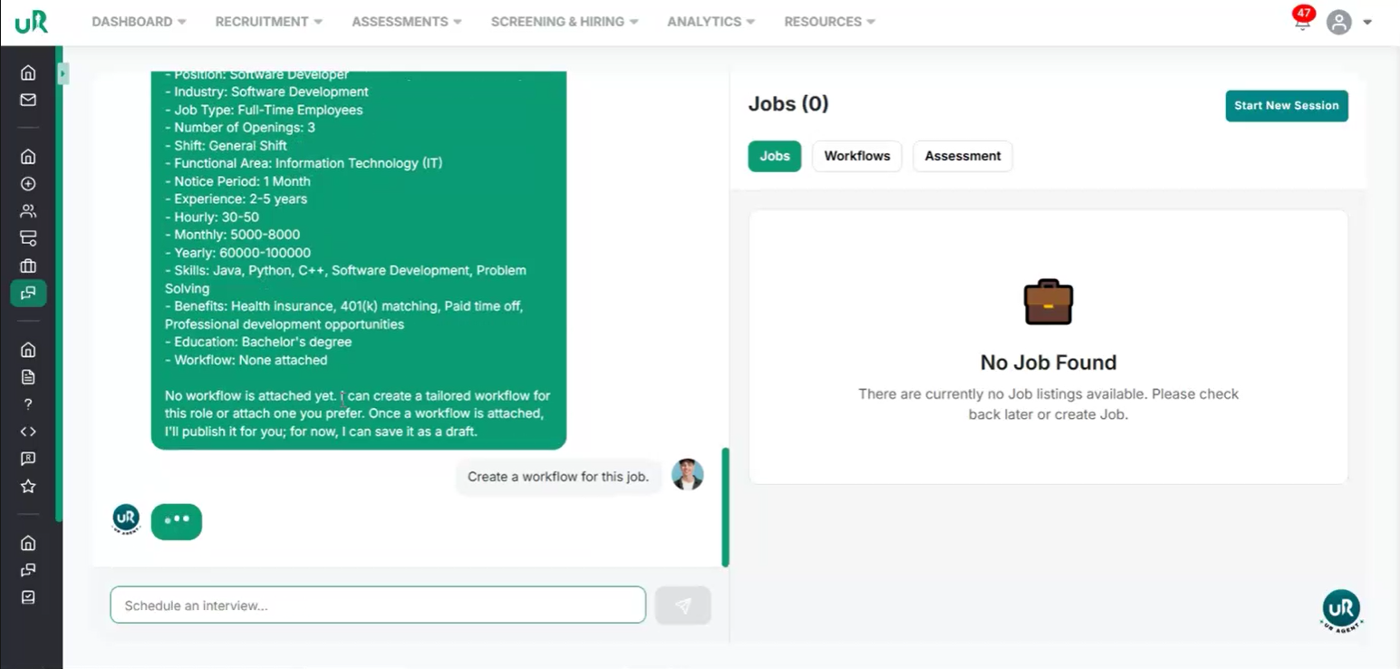 Create a Workflow for the Job If there is no workflow currently attached, you will only be able to draft the job. To fully enable the job posting, create a workflow specifically for this job. Proceed to add a workflow with at least two interview or assessment rounds that are relevant to the Software Developer position. This can be done by giving the command “Create a workflow for this job”