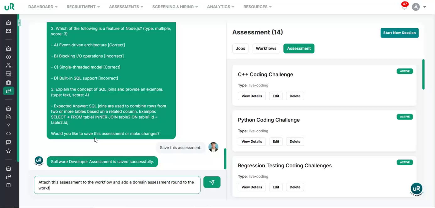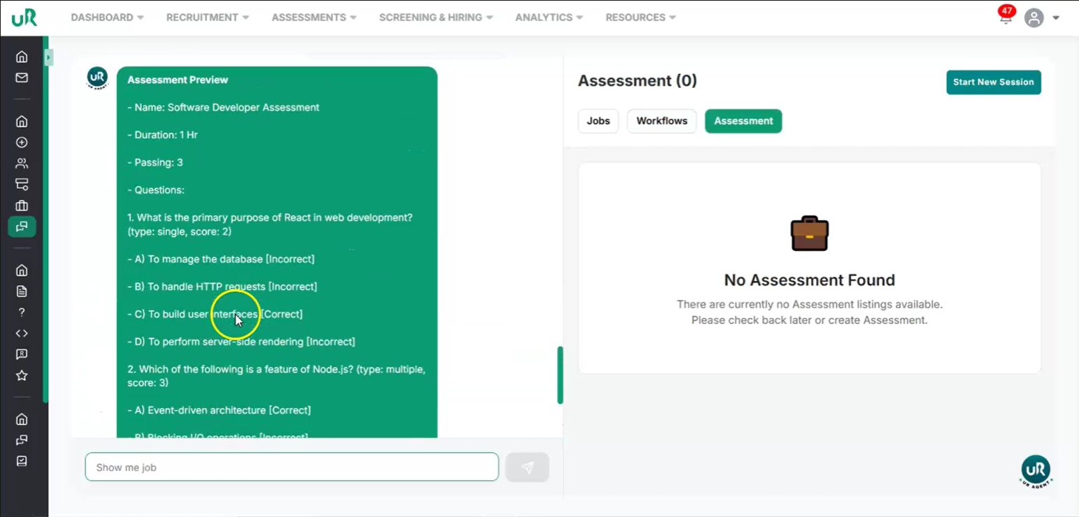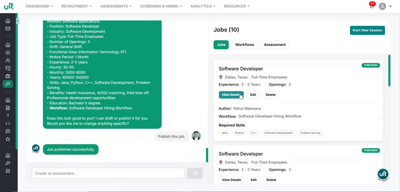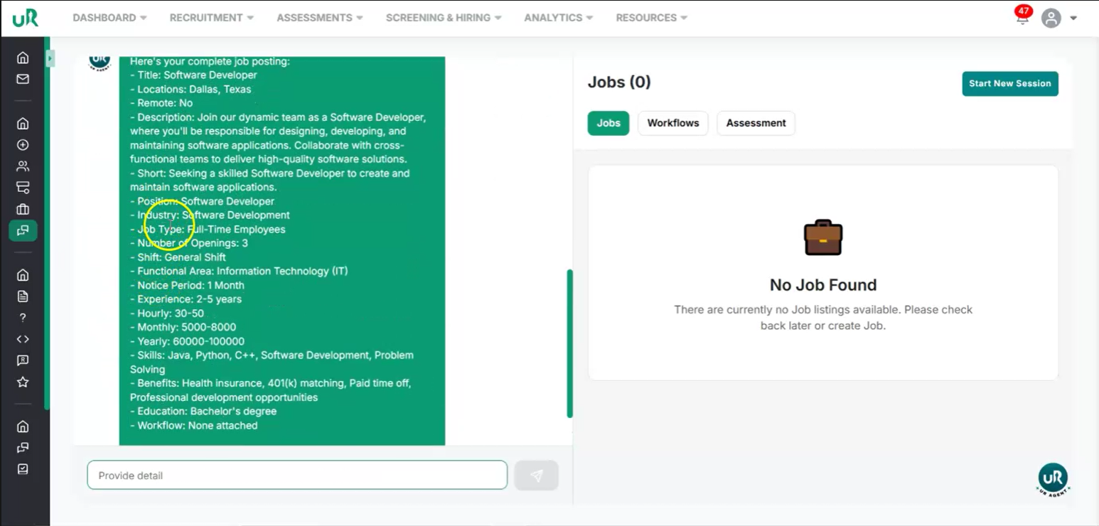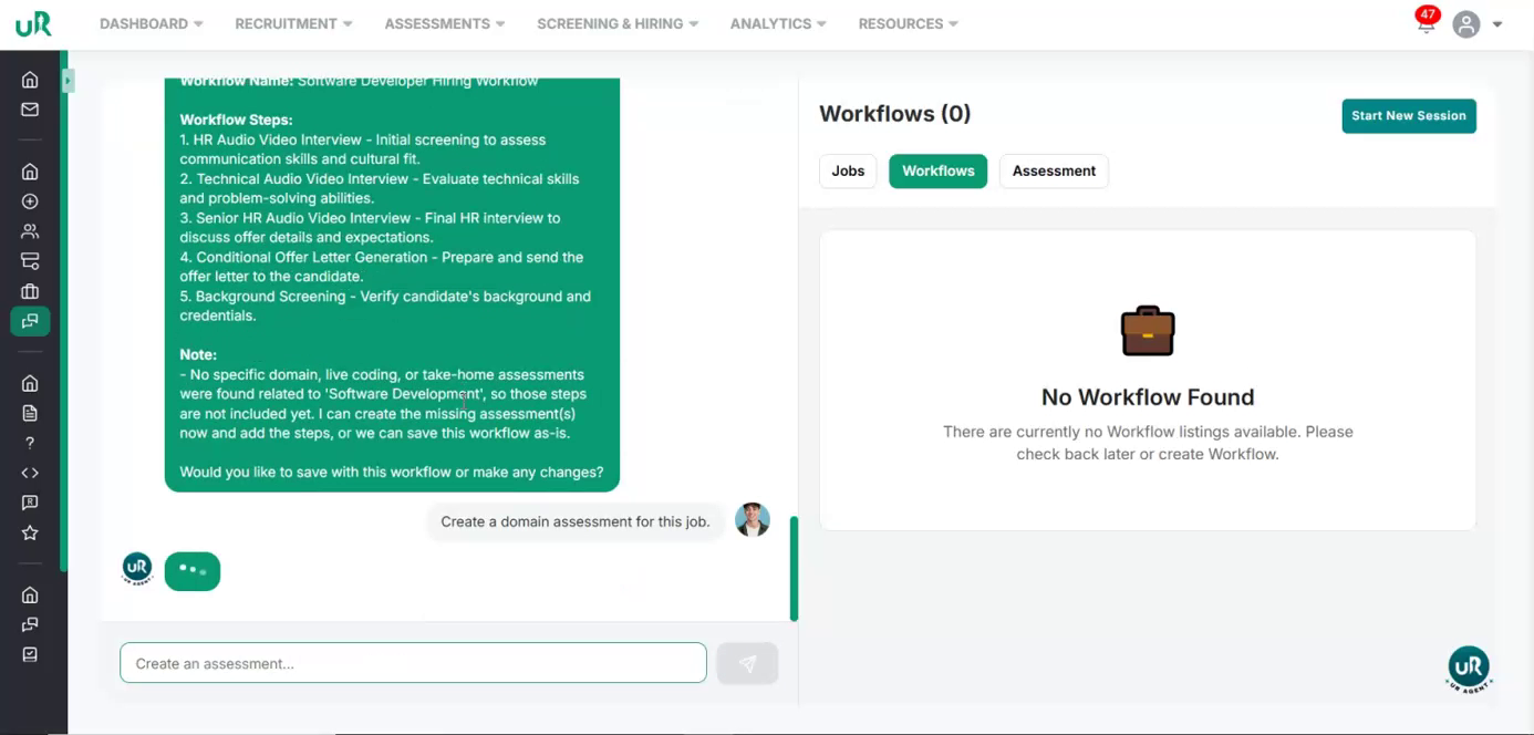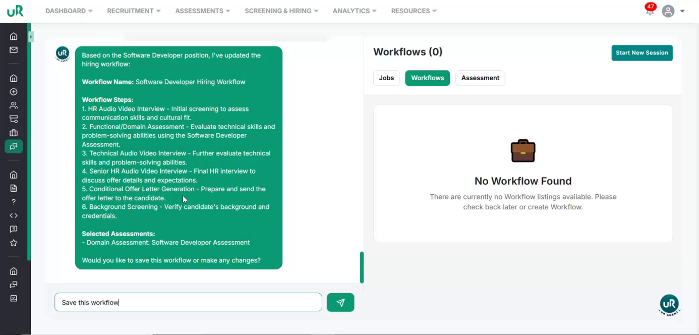 Create a Workflow for the Job If there is no workflow currently attached, you will only be able to draft the job. To fully enable the job posting, create a workflow specifically for this job. Proceed to add a workflow with at least two interview or assessment rounds that are relevant to the Software Developer position. This can be done by giving the command “Create a workflow for this job”