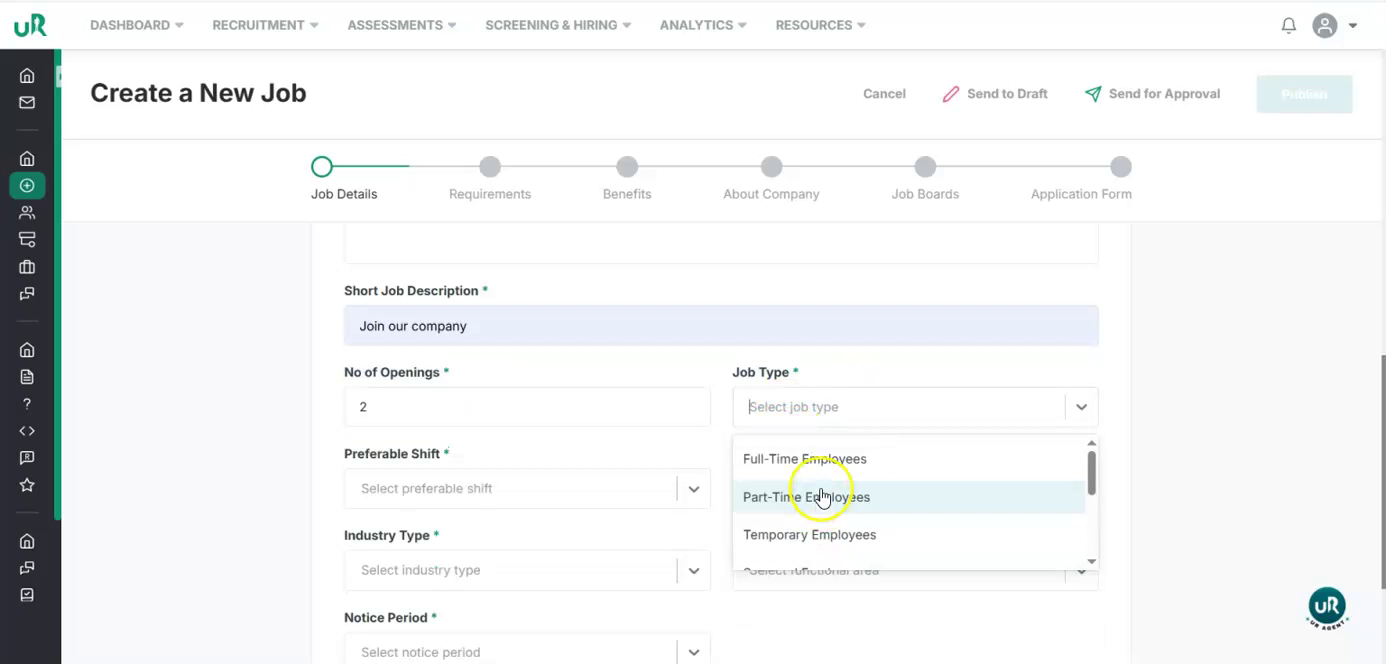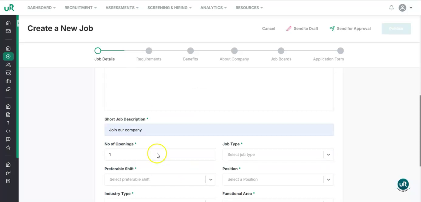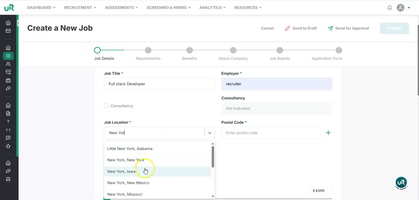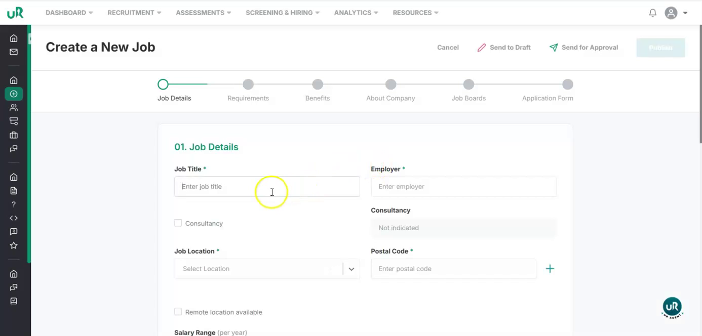 Start Creating a New Job Begin by navigating to the job creation section in the UI and start a new job posting.