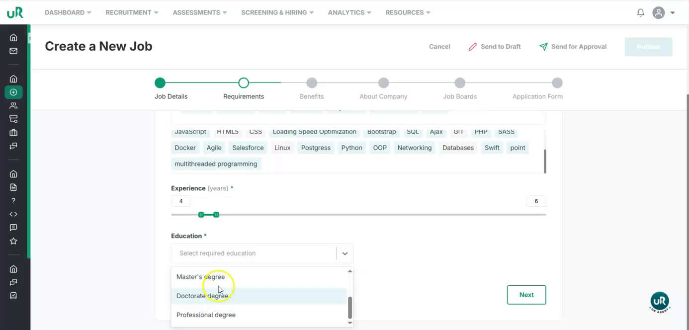 Set Experience, Education, and Benefits Finalize the candidate profile and perks: