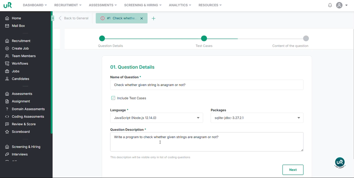 - Click "Next" and enter the first question (e.g., "Check whether the given string is an anagram or not")
