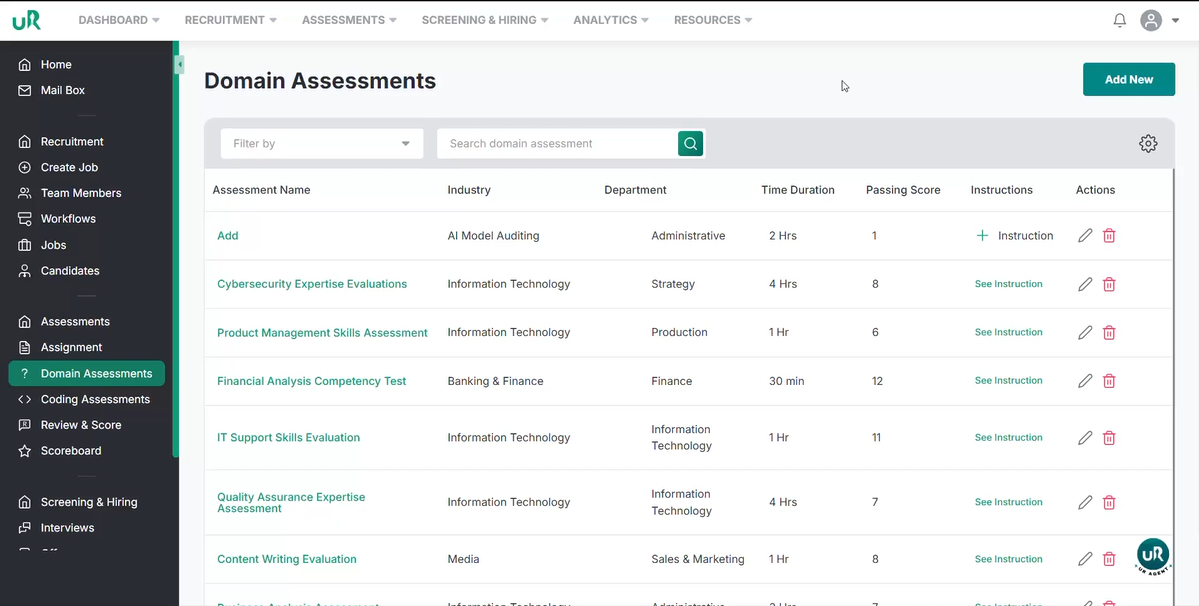 Add New Assessment: Click the "Add New" button to start creating a new assessment.
