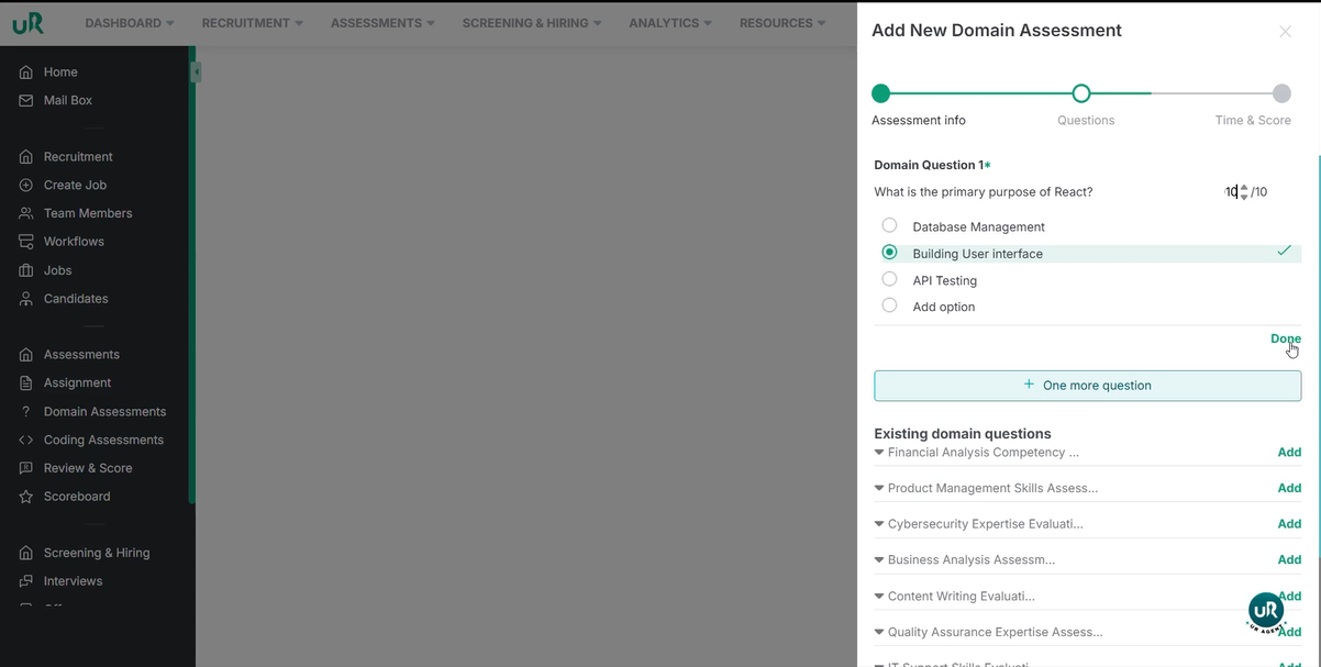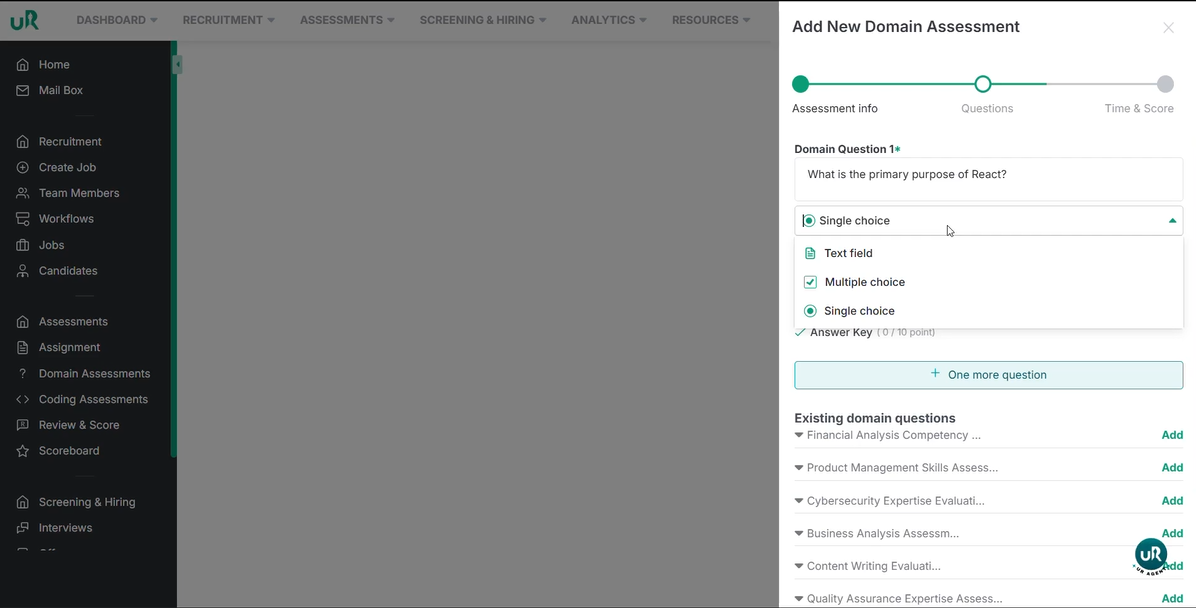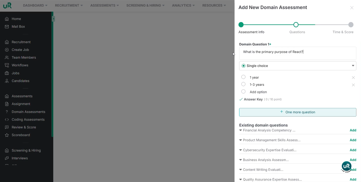 - Enter the assessment name (e.g., "React and Developer Skills") .