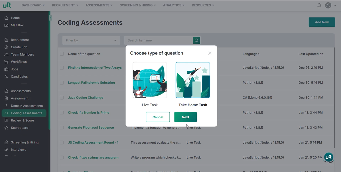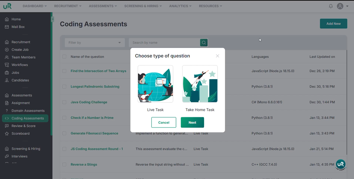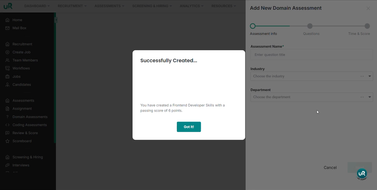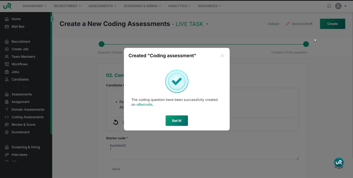 You have successfully learned how to create domain-based assessments, LiveTask coding assessments, and TakeHomeTask coding assessments.