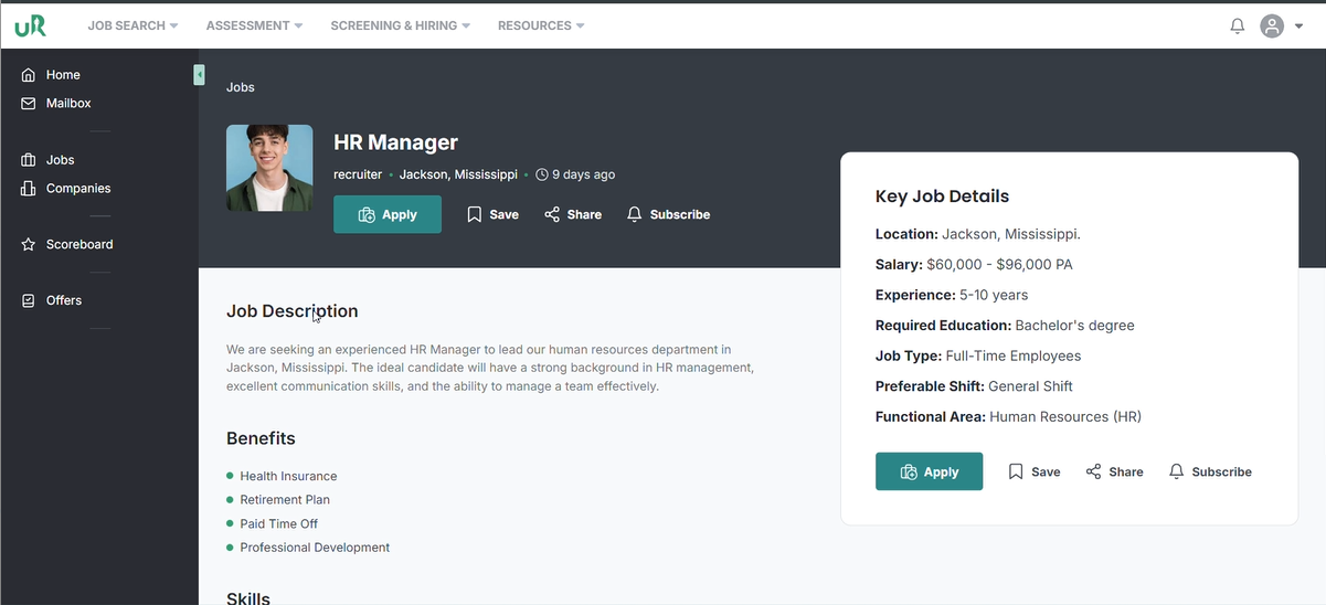 On the candidates interface, the candidate will apply for the job e.g., HR Manager by simply selecting it, and then clicking on the Apply button.
