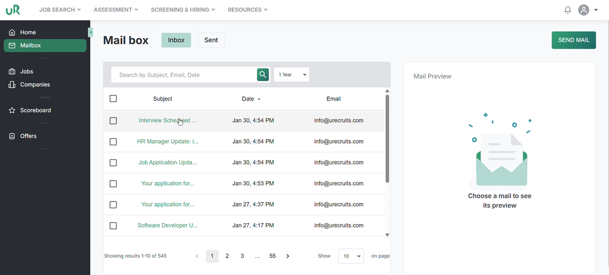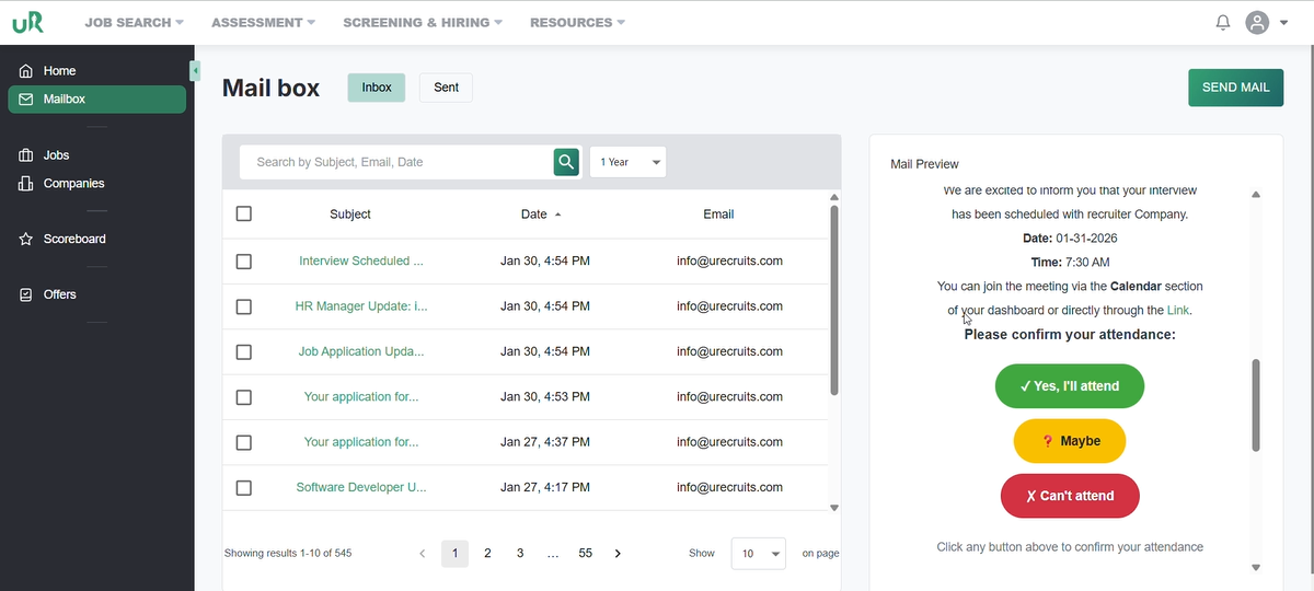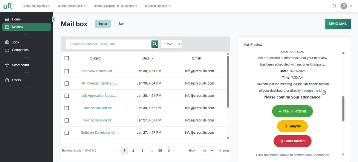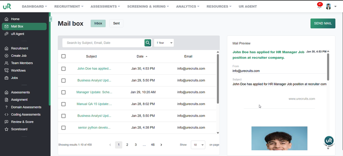 On the recruiters interface, the recruiter will be notified with a mail, which he can access by clicking on the Mail Box, where he will find the candidate who has applied for the job.