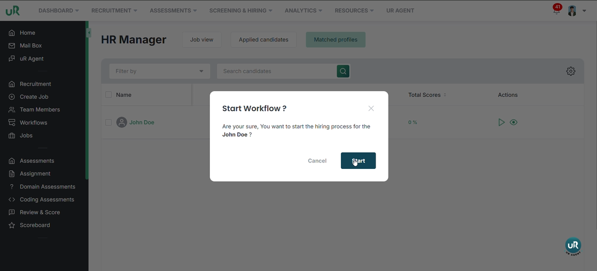 Start the workflow for the candidate by clicking on the Start Workflow button.