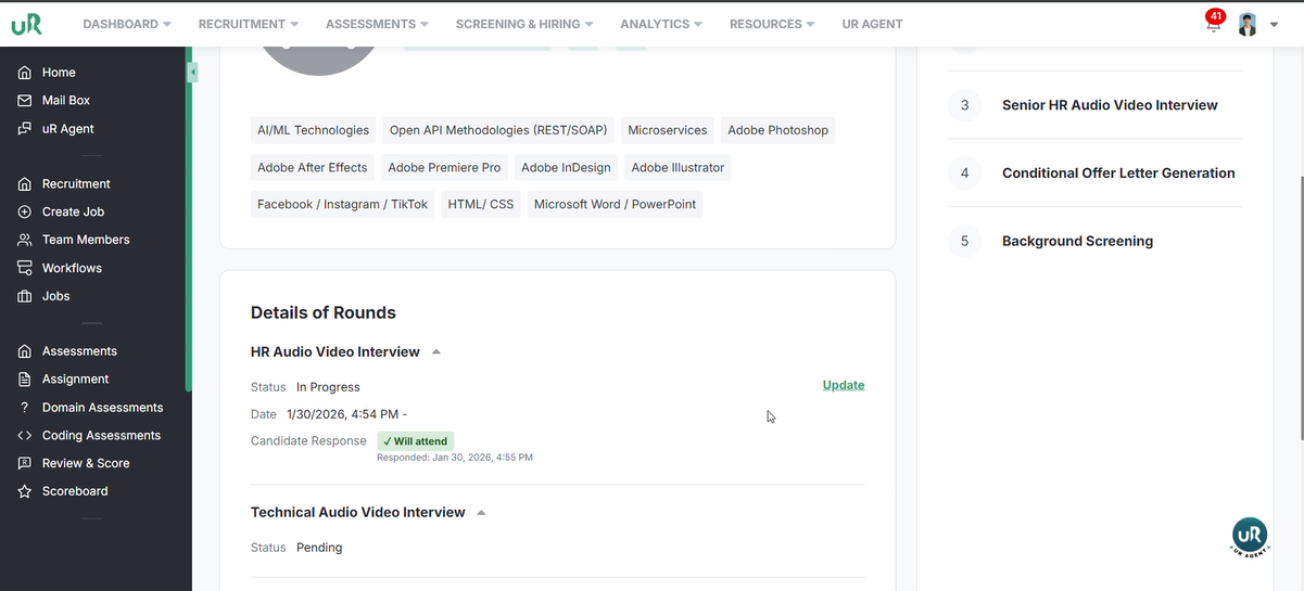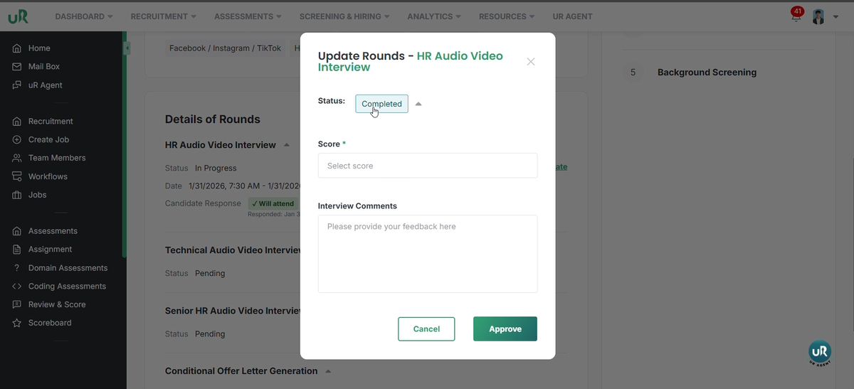 Once the meeting is complete. The recruiter can go into the candidates scoreboard and update the status, give him the score and comments.